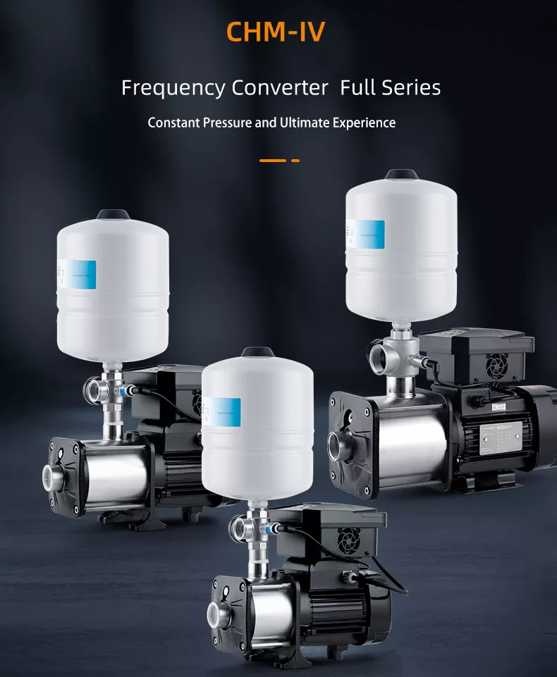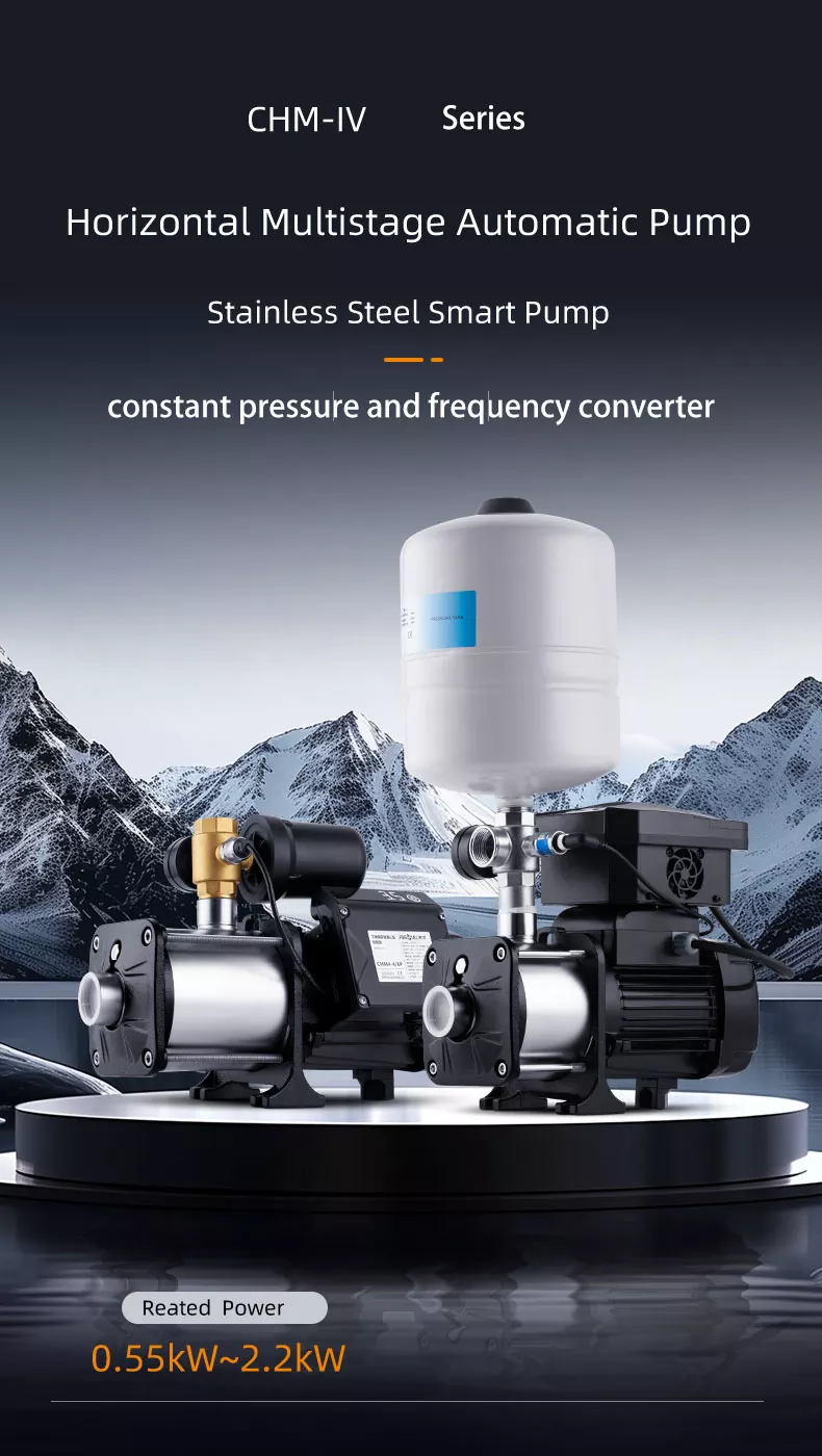 Горизонтальний багатоступеневий багатоступінчастий відцентровий насос серії CHM20/IV інтелектуального інвертора з нержавіючої сталі є відносно зрілим продуктом на ринку в даний час, який має компактну структуру та стабільну роботу, низький робочий шум, ефективність до 44-70%. Усі компоненти, що пропускають воду, виготовлені з нержавіючої сталі AISI304. Вона широко використовується в
