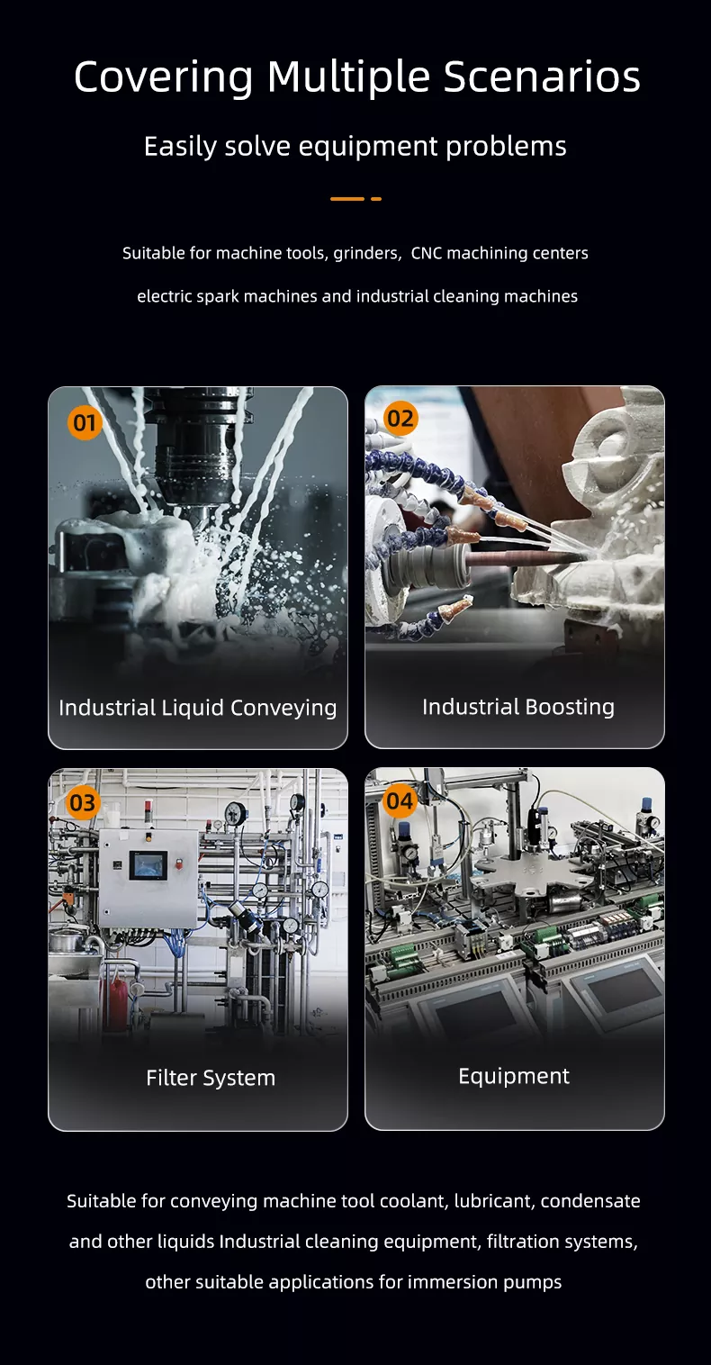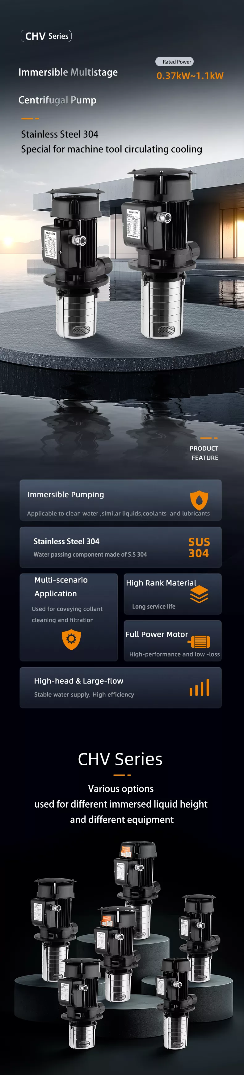 Нижче наведено представлення серії CHV. Занурювальний багатоступінчастий відцентровий насос CHV, також відомий як занурювальний насос або машинний насос, використовується для транспортування охолоджувальної рідини, мастила, передачі конденсату, промислового очисного обладнання, систем фільтрації та інших застосувань, придатних для використання занурених насосів. Він ідеально підходить для інтеграції з верстатами, шліфувальними верстатами, обробними центрами з ЧПУ, електророзійними машинами, промисловими очисними машинами та іншим обладнанням.
