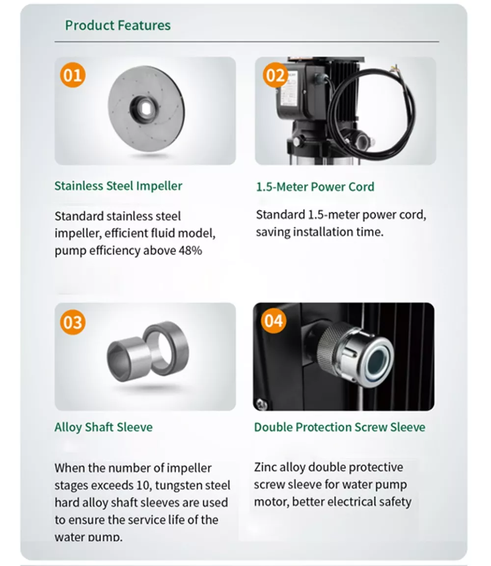 · Механічні ущільнення з твердого сплаву + фторкаучук зменшують витік і споживання енергії, забезпечуючи плавну і тиху роботу.